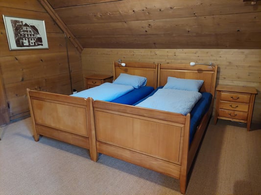 Zur Unterkunft gehört eine gut eingerichtete Küche für Selbstkocher (Gaskochherd, Umluftofen) und 2 Kühlschränke. Gemütlicher Essraum; grosser Aufenthaltsraum im Dachstock kann dazu gemietet werden.